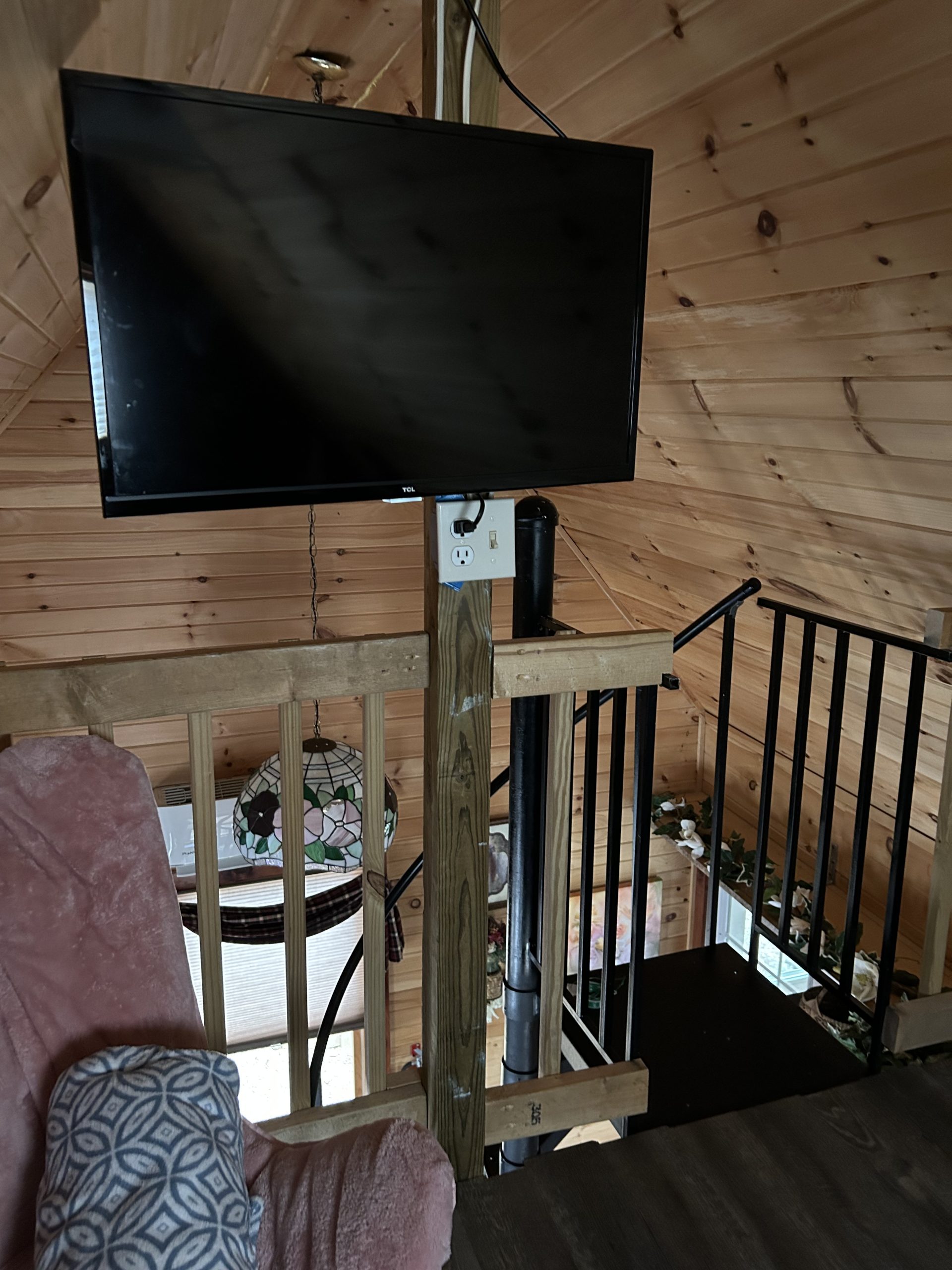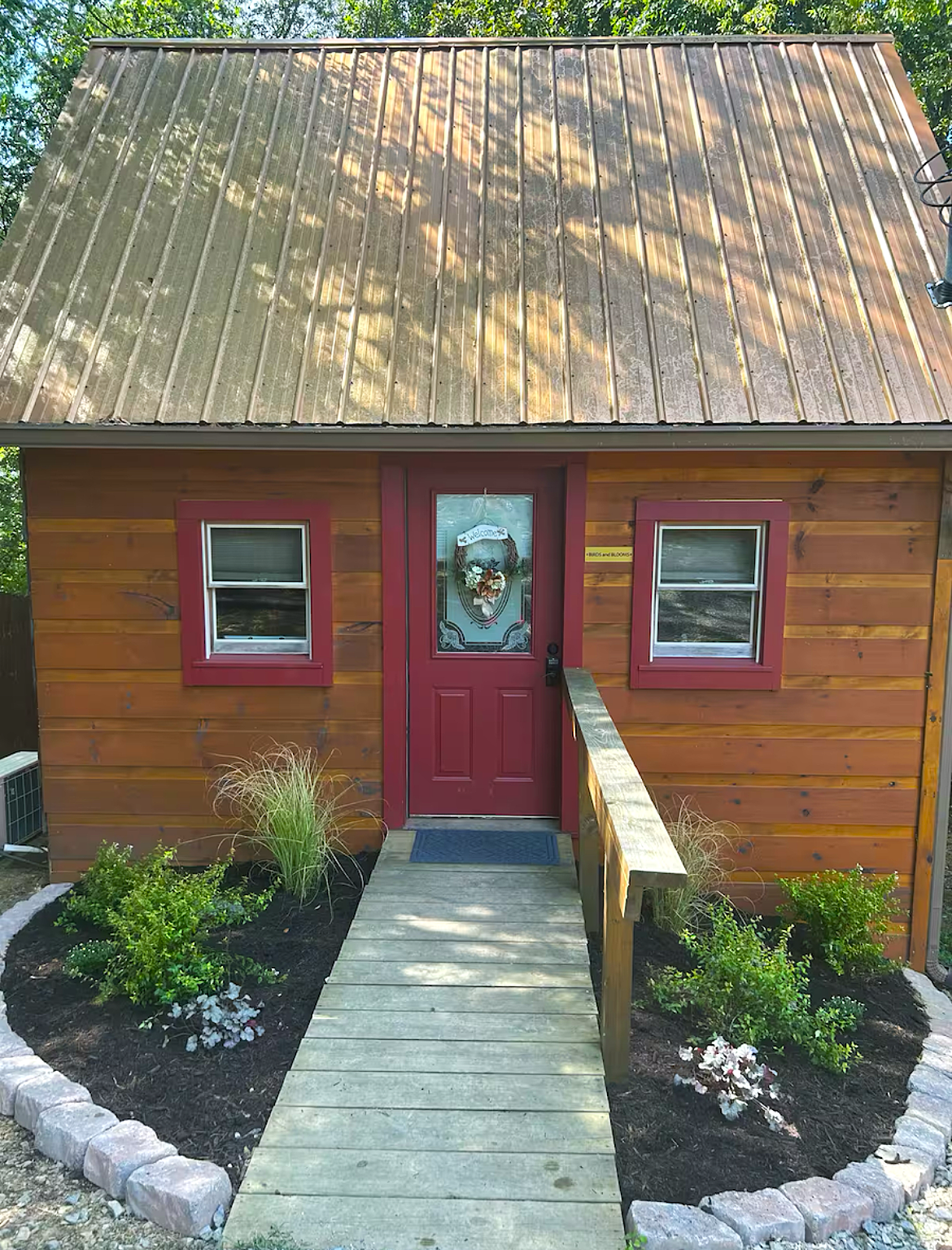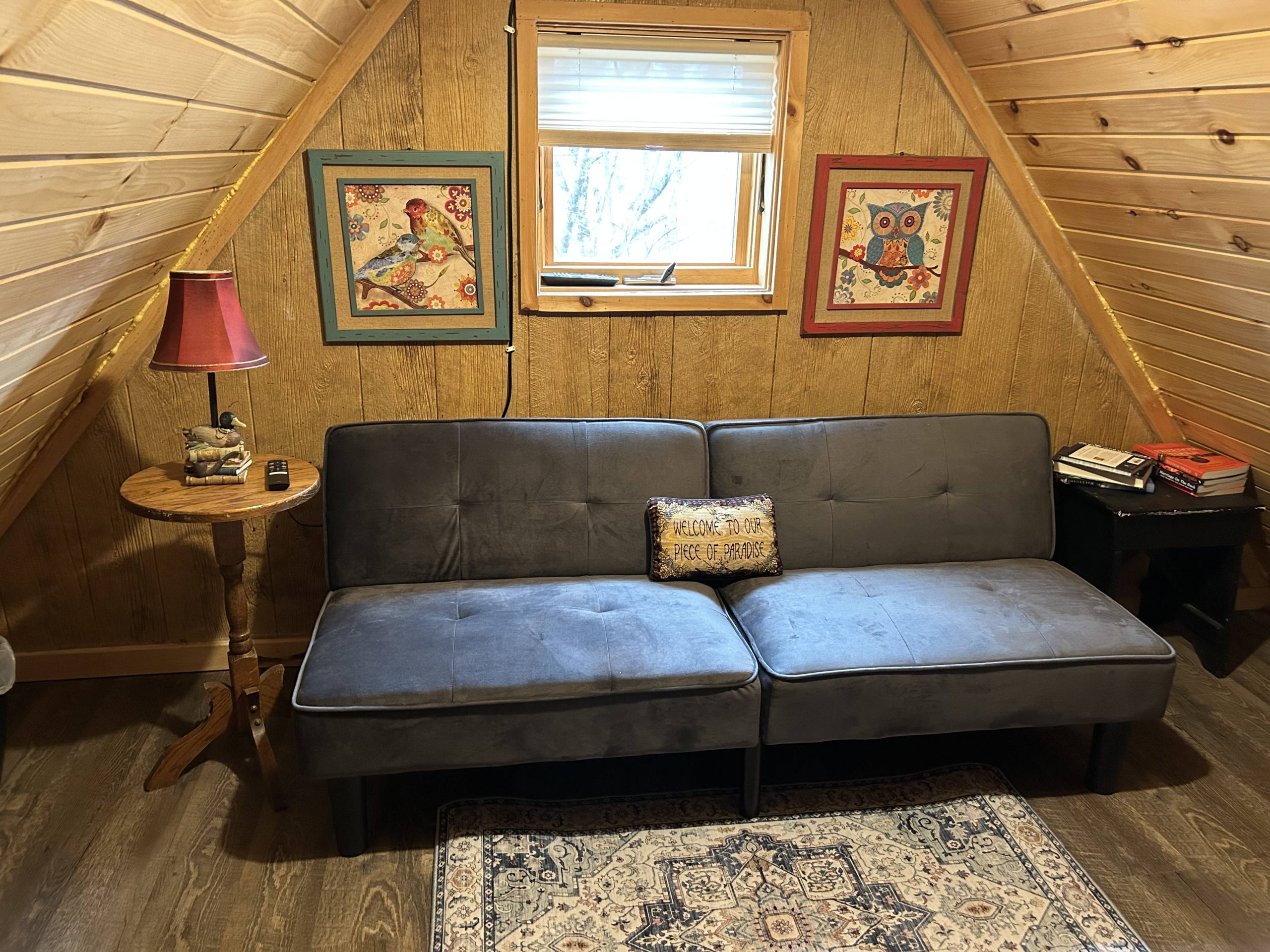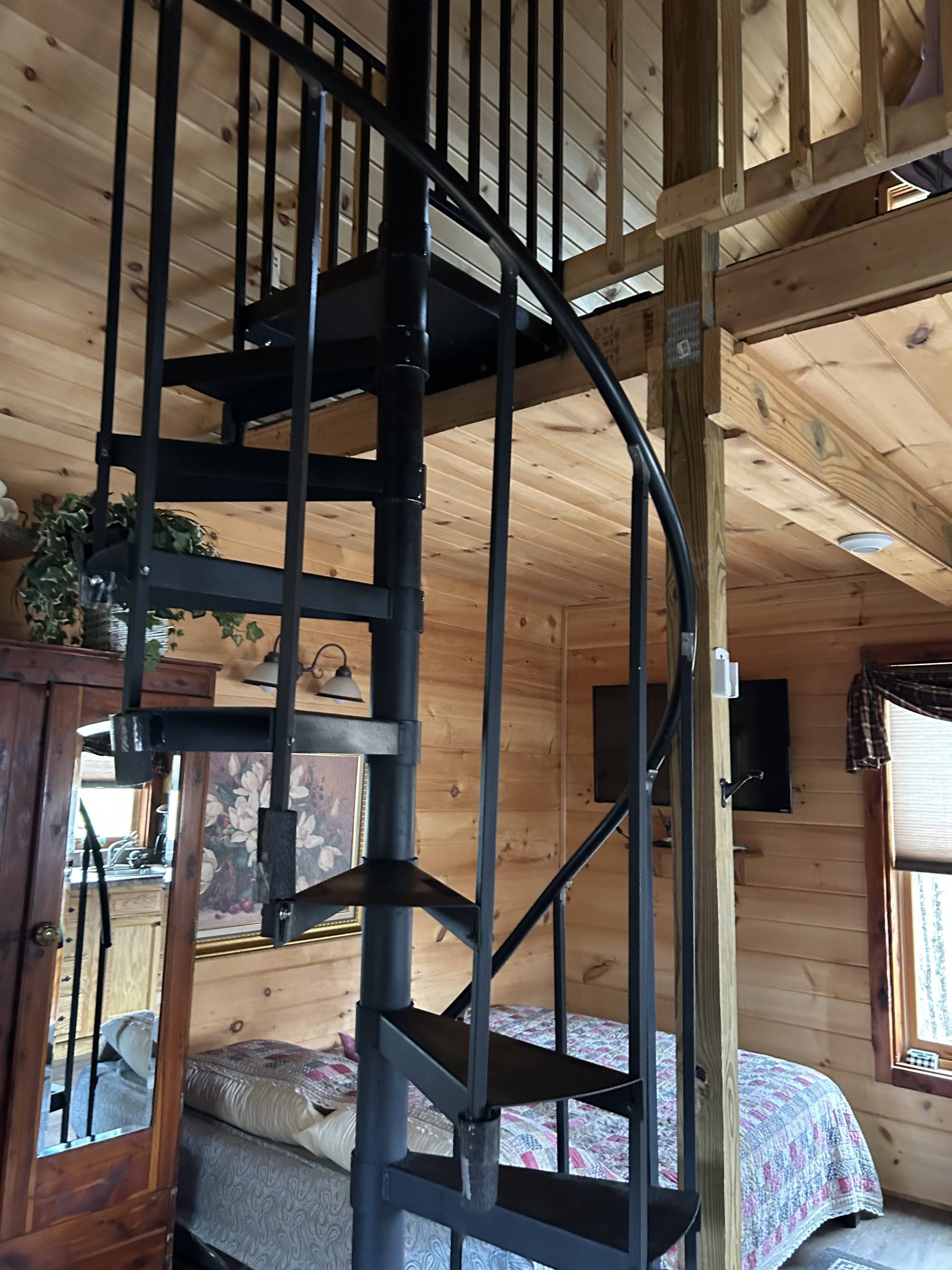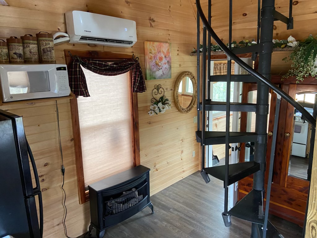 For a tiny home, this overnight rental is surprisingly spacious! Tall ceilings, an open kitchen and living area with fireplace, and a beautiful spiral staircase give it plenty of character and comfort. The Queen bedroom is now located downstairs for easier access, while the upstairs loft has been converted into a cozy TV room or flex space for relaxing, reading, or extra sleeping room if needed. The bonus sunroom includes a dining area and stacked washer/dryer, and from there you can step out to the back deck to unwind in the hot tub and enjoy the peaceful setting.