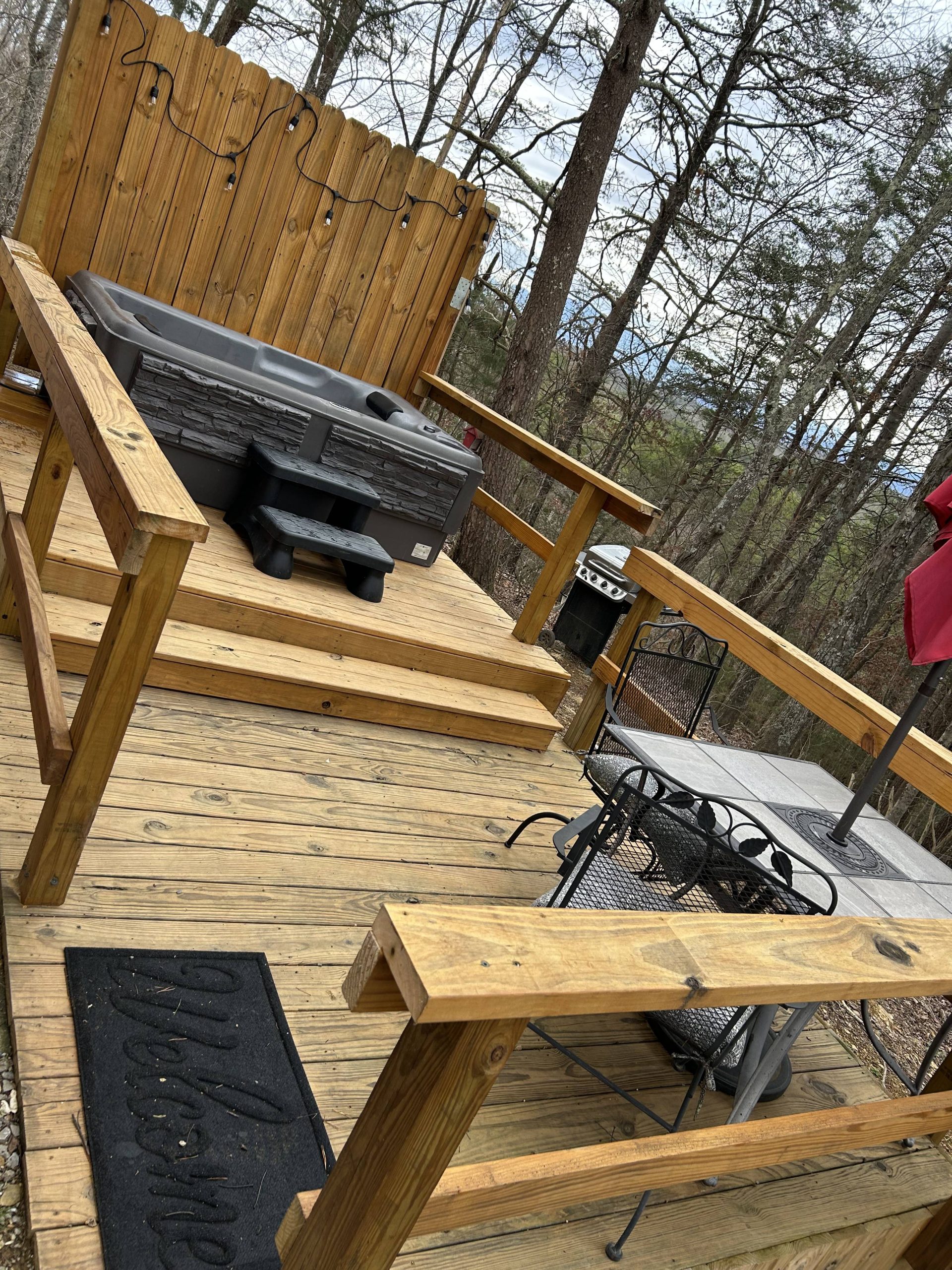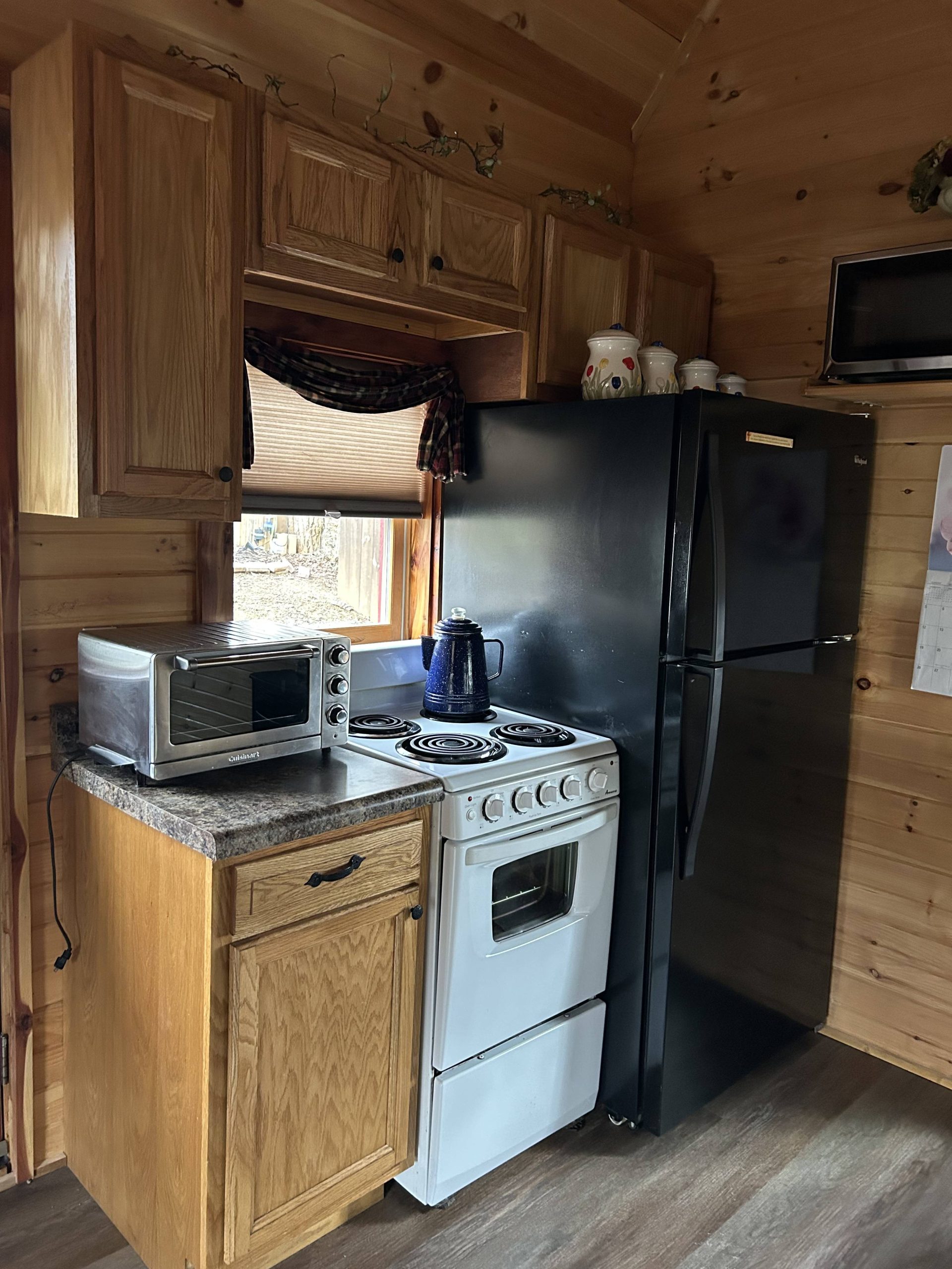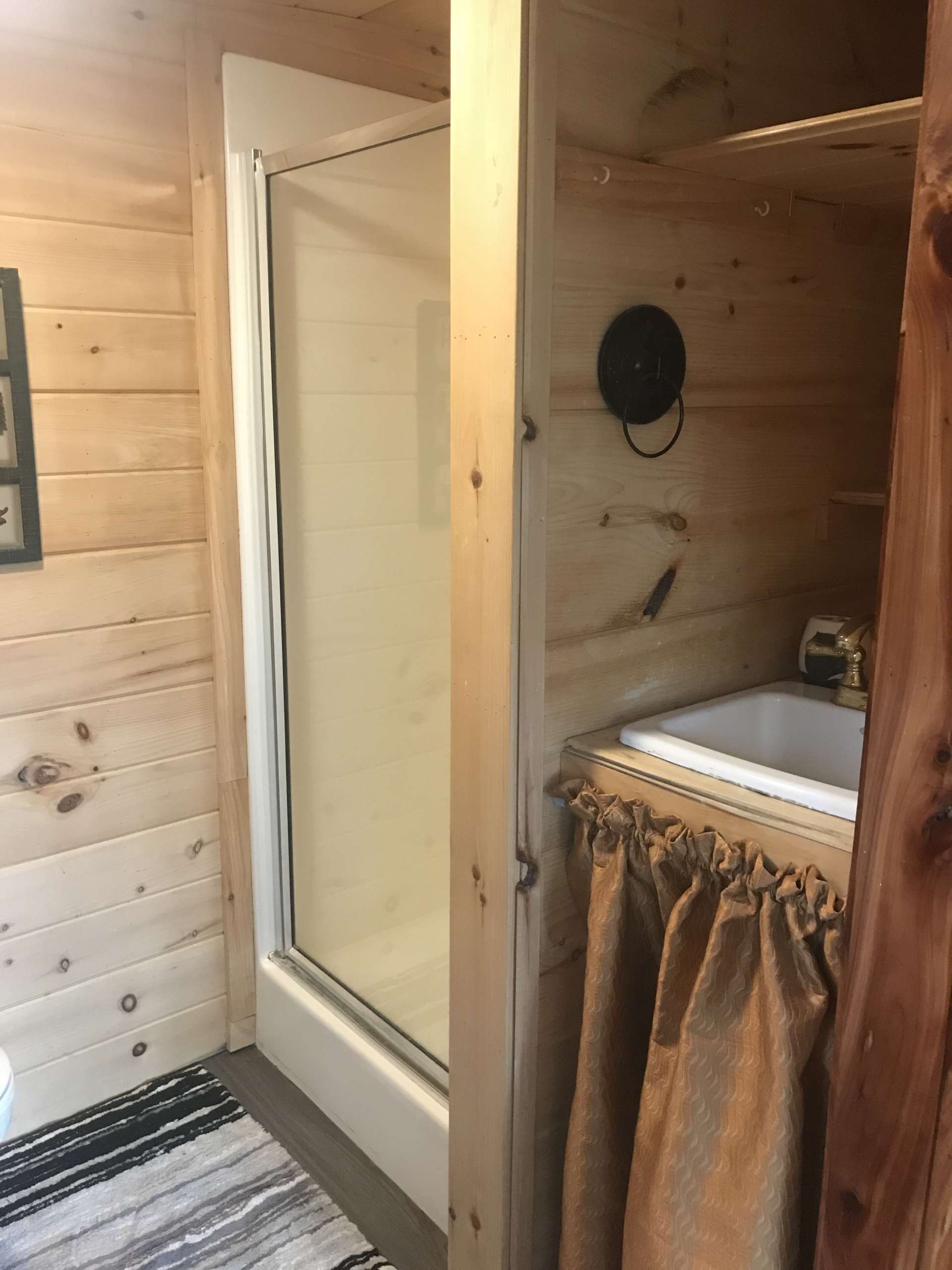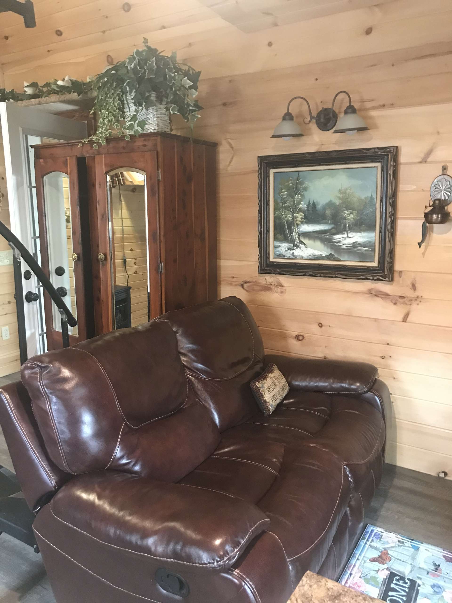 For a tiny home, this overnight rental is surprisingly spacious! Tall ceilings, an open kitchen and living area with fireplace, and a beautiful spiral staircase give it plenty of character and comfort. The Queen bedroom is now located downstairs for easier access, while the upstairs loft has been converted into a cozy TV room or flex space for relaxing, reading, or extra sleeping room if needed. The bonus sunroom includes a dining area and stacked washer/dryer, and from there you can step out to the back deck to unwind in the hot tub and enjoy the peaceful setting.
