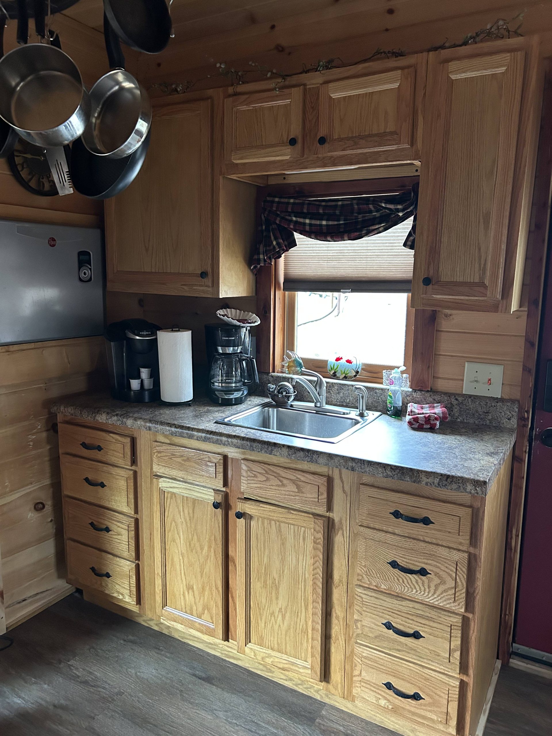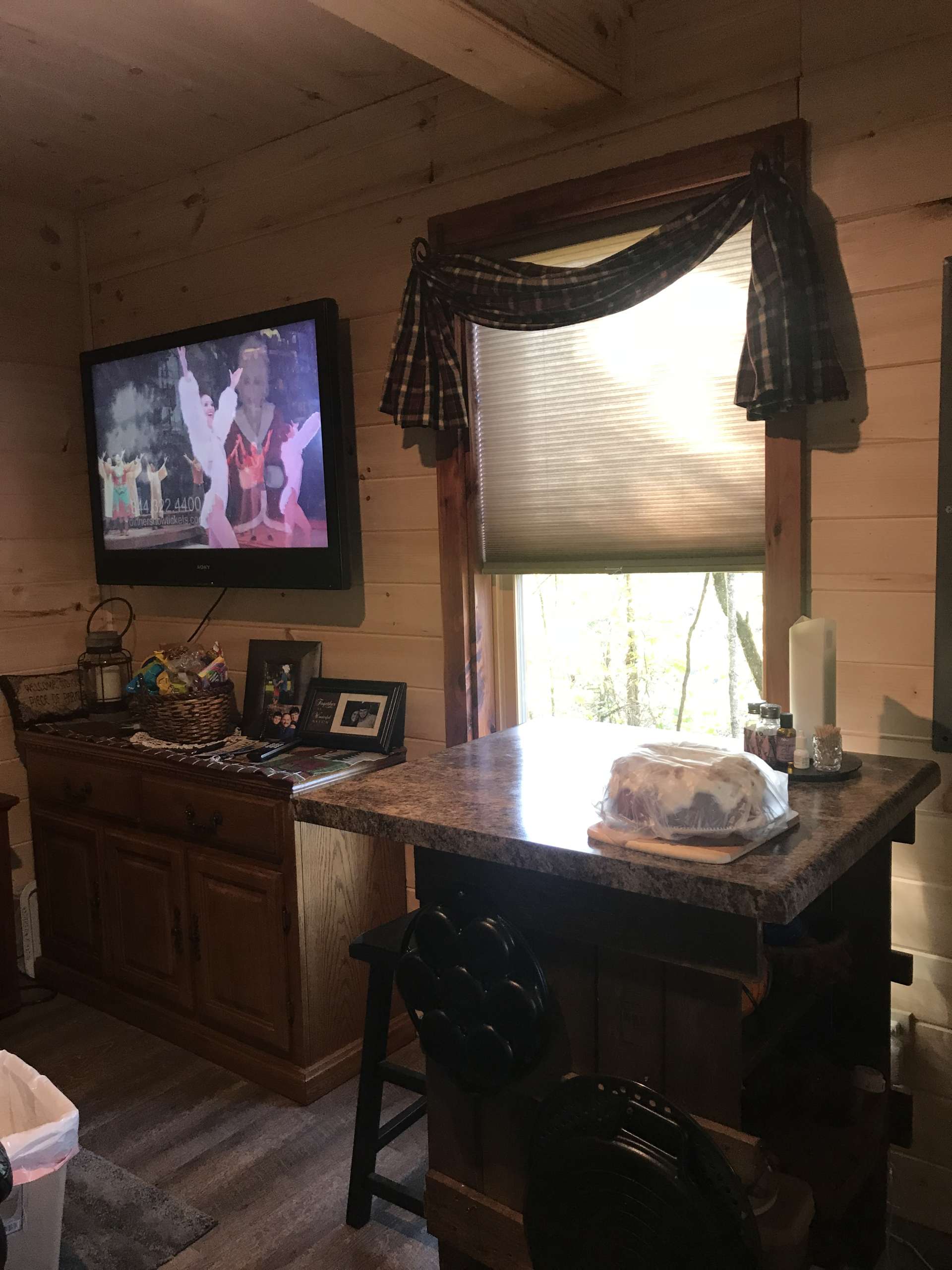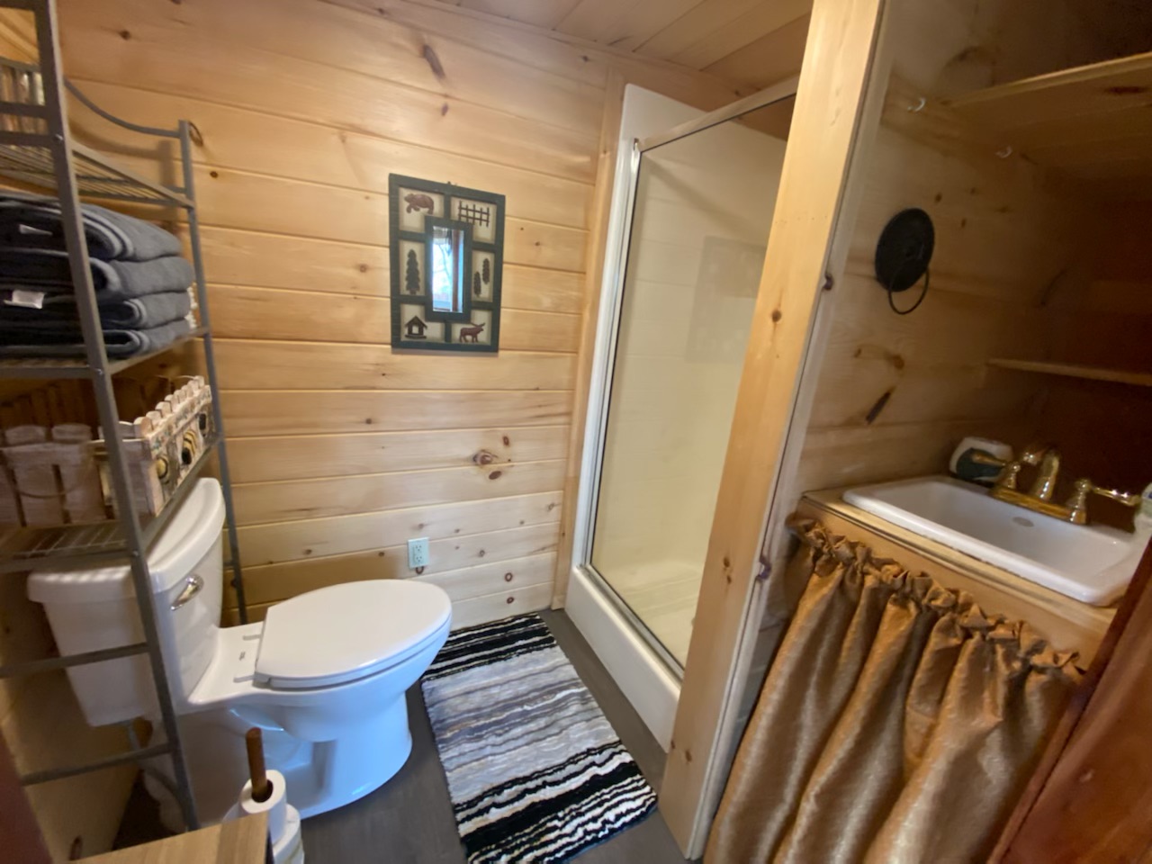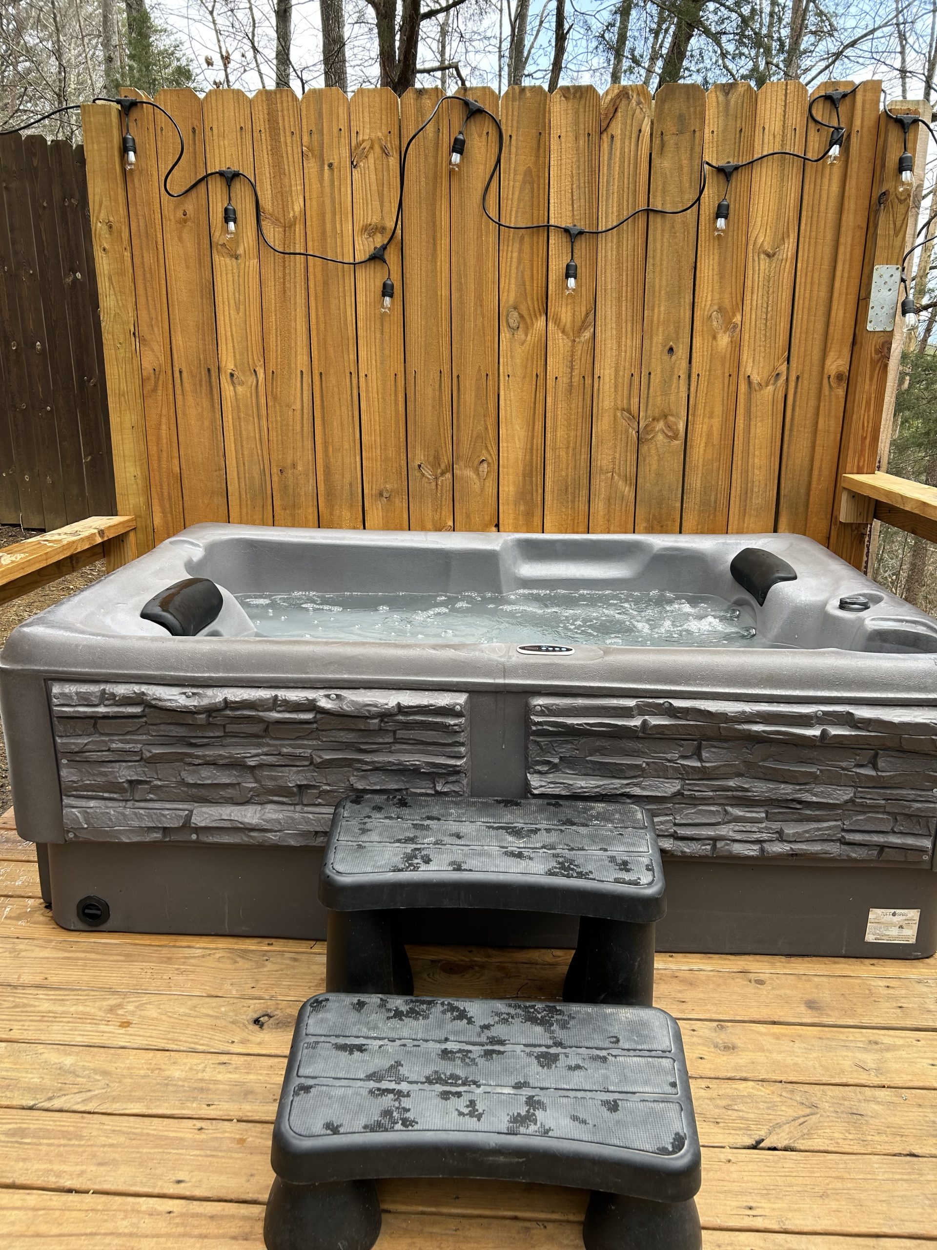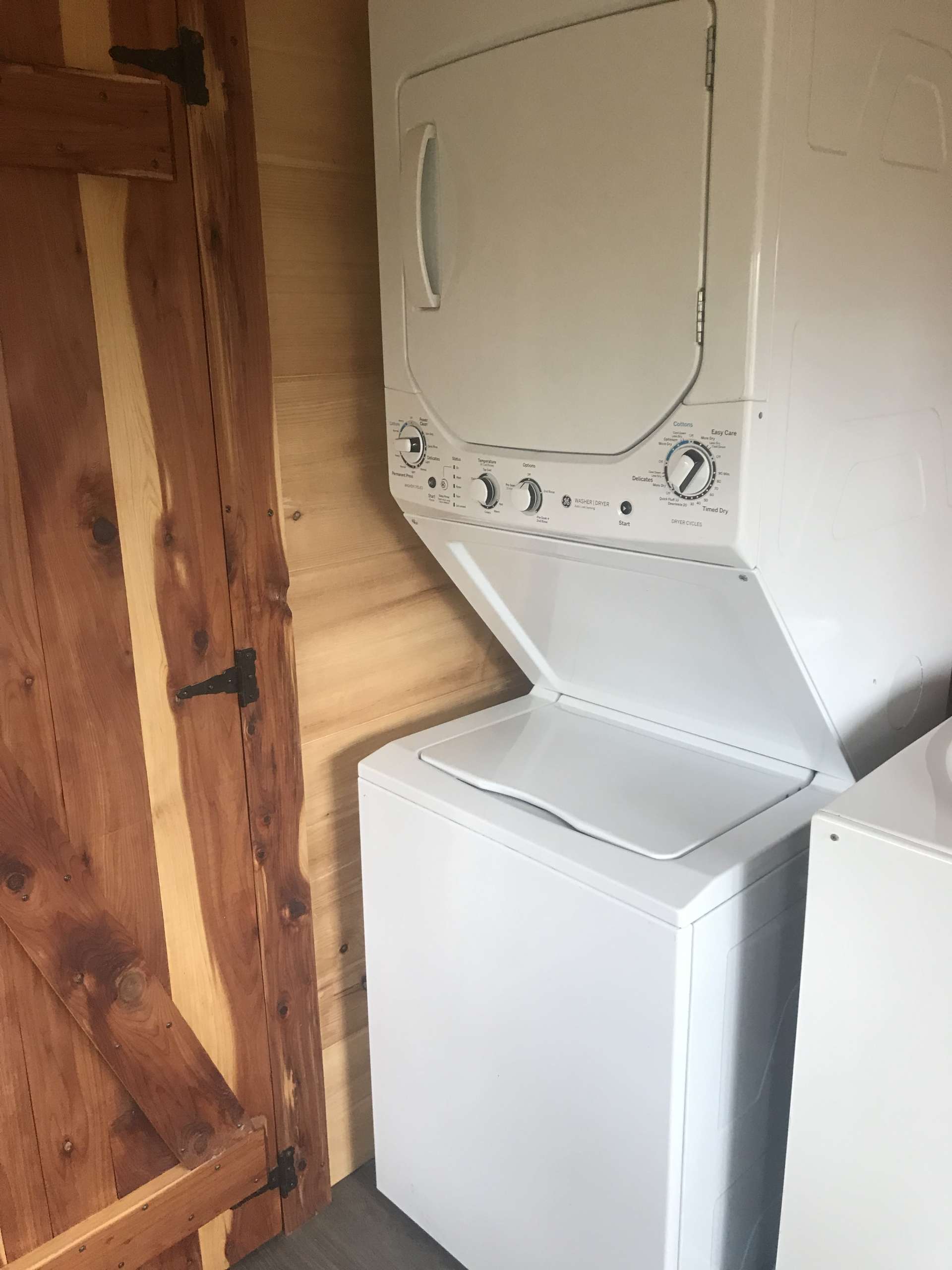 For a tiny home, this overnight rental is surprisingly spacious! Tall ceilings, an open kitchen and living area with fireplace, and a beautiful spiral staircase give it plenty of character and comfort. The Queen bedroom is now located downstairs for easier access, while the upstairs loft has been converted into a cozy TV room or flex space for relaxing, reading, or extra sleeping room if needed. The bonus sunroom includes a dining area and stacked washer/dryer, and from there you can step out to the back deck to unwind in the hot tub and enjoy the peaceful setting.