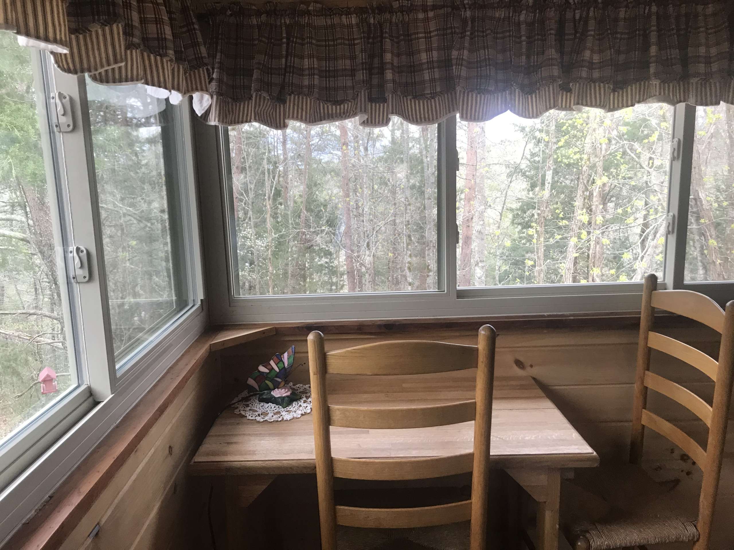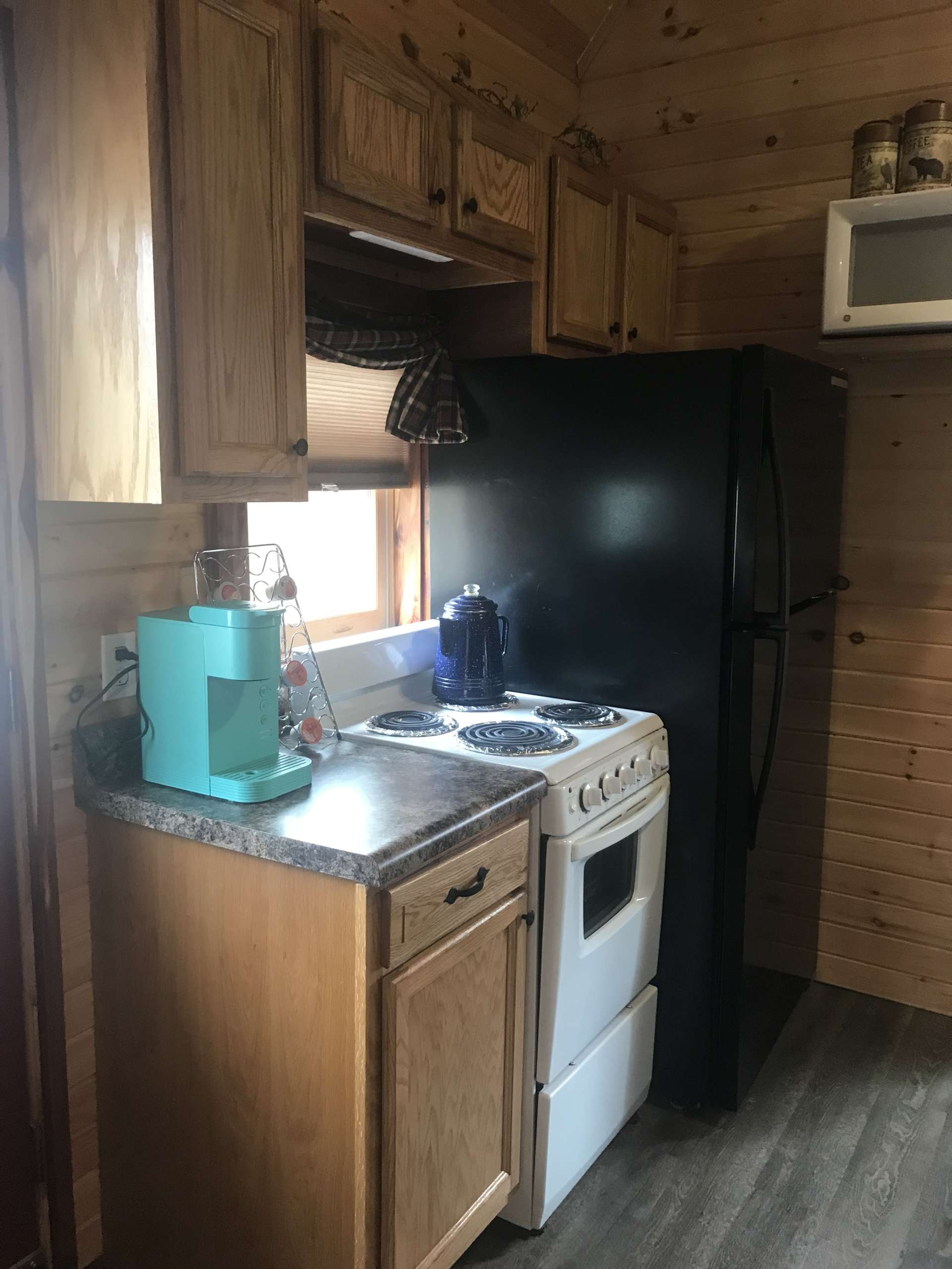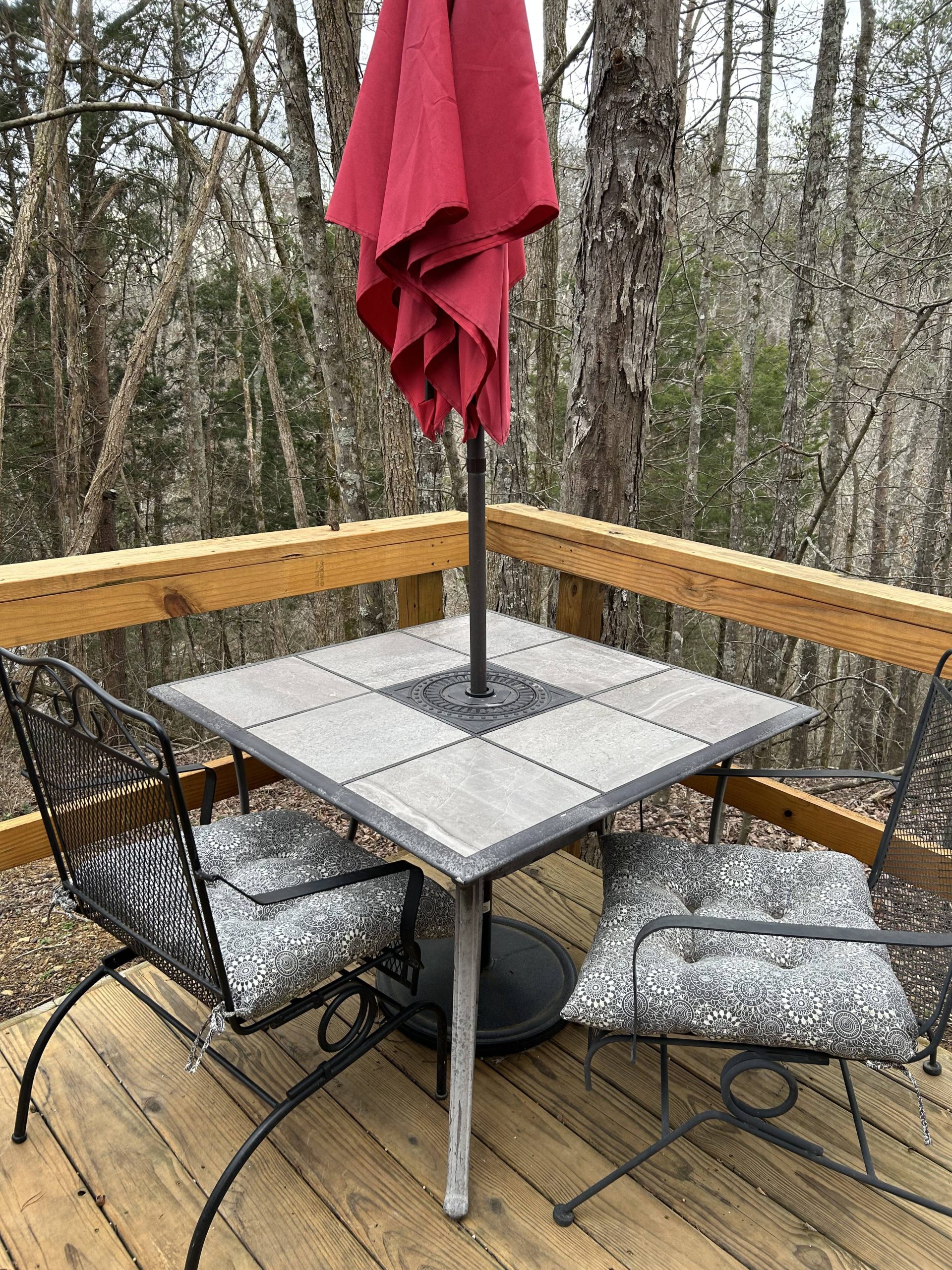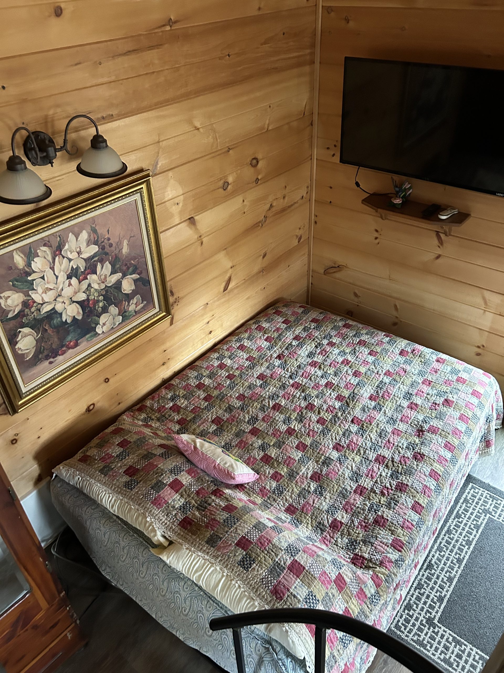 For a tiny home, this overnight rental is surprisingly spacious! Tall ceilings, an open kitchen and living area with fireplace, and a beautiful spiral staircase give it plenty of character and comfort. The Queen bedroom is now located downstairs for easier access, while the upstairs loft has been converted into a cozy TV room or flex space for relaxing, reading, or extra sleeping room if needed. The bonus sunroom includes a dining area and stacked washer/dryer, and from there you can step out to the back deck to unwind in the hot tub and enjoy the peaceful setting.