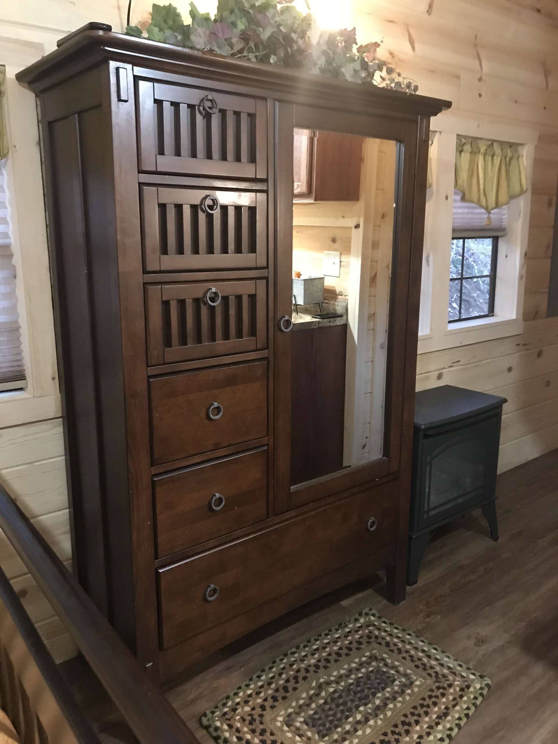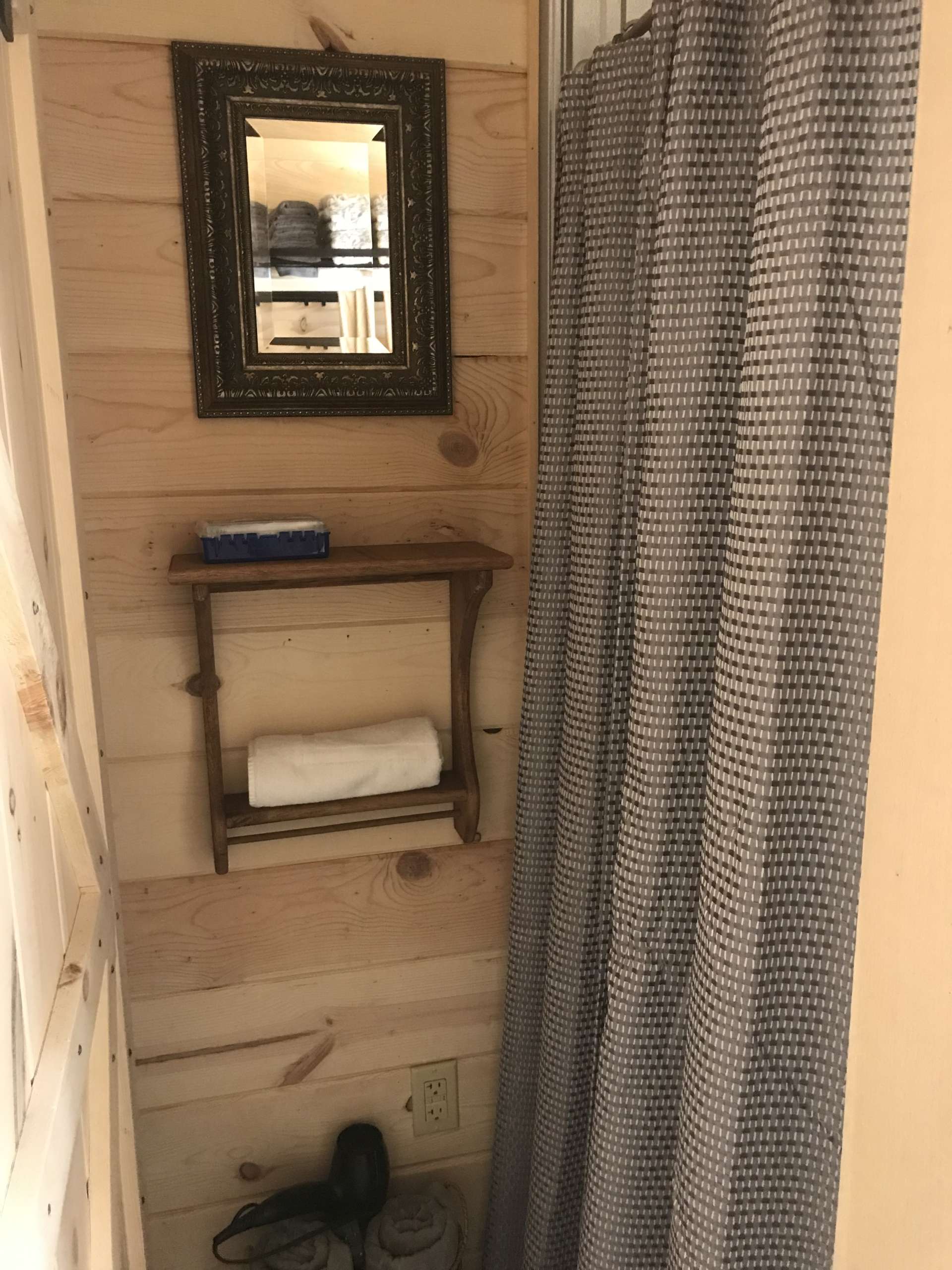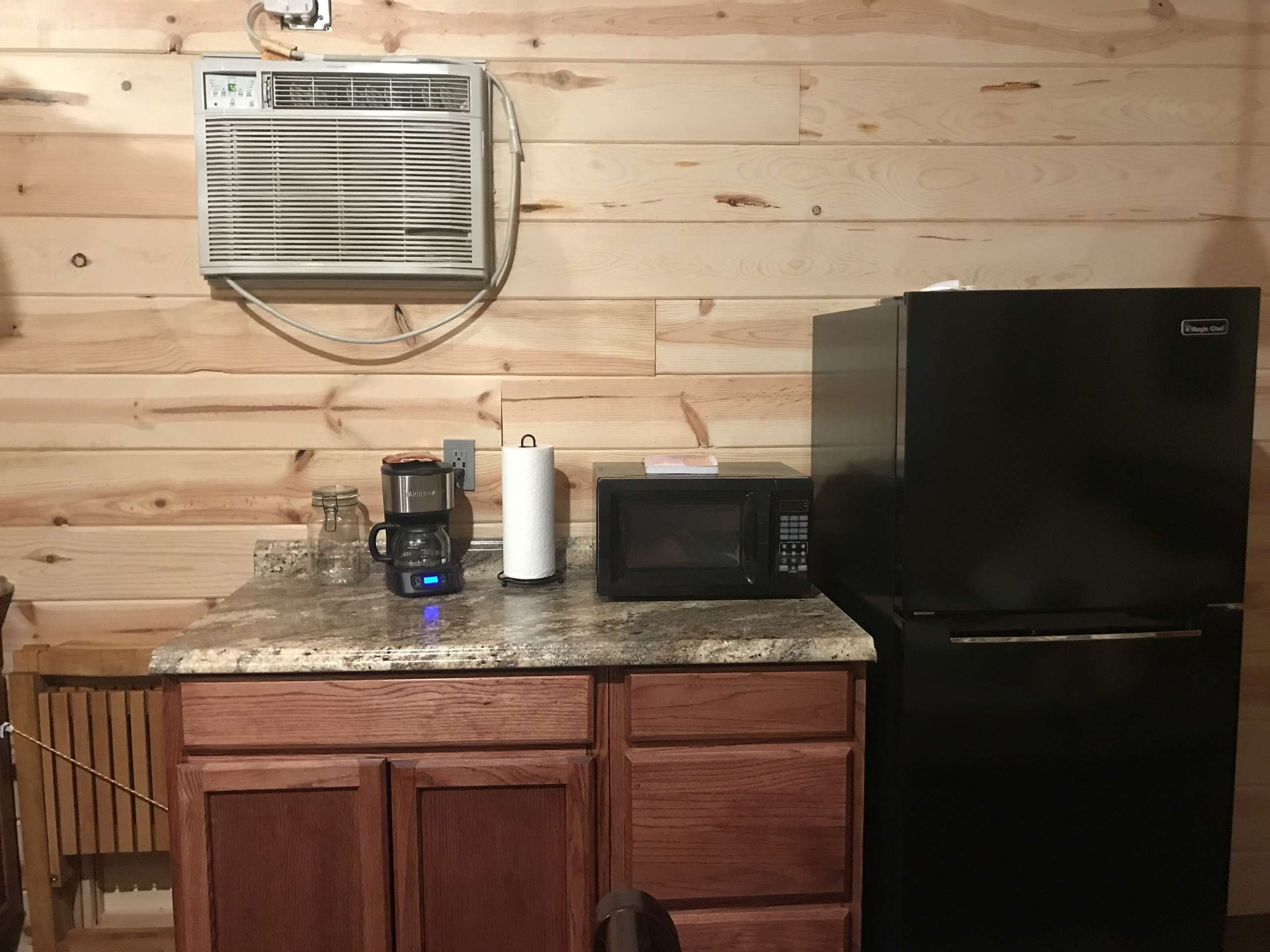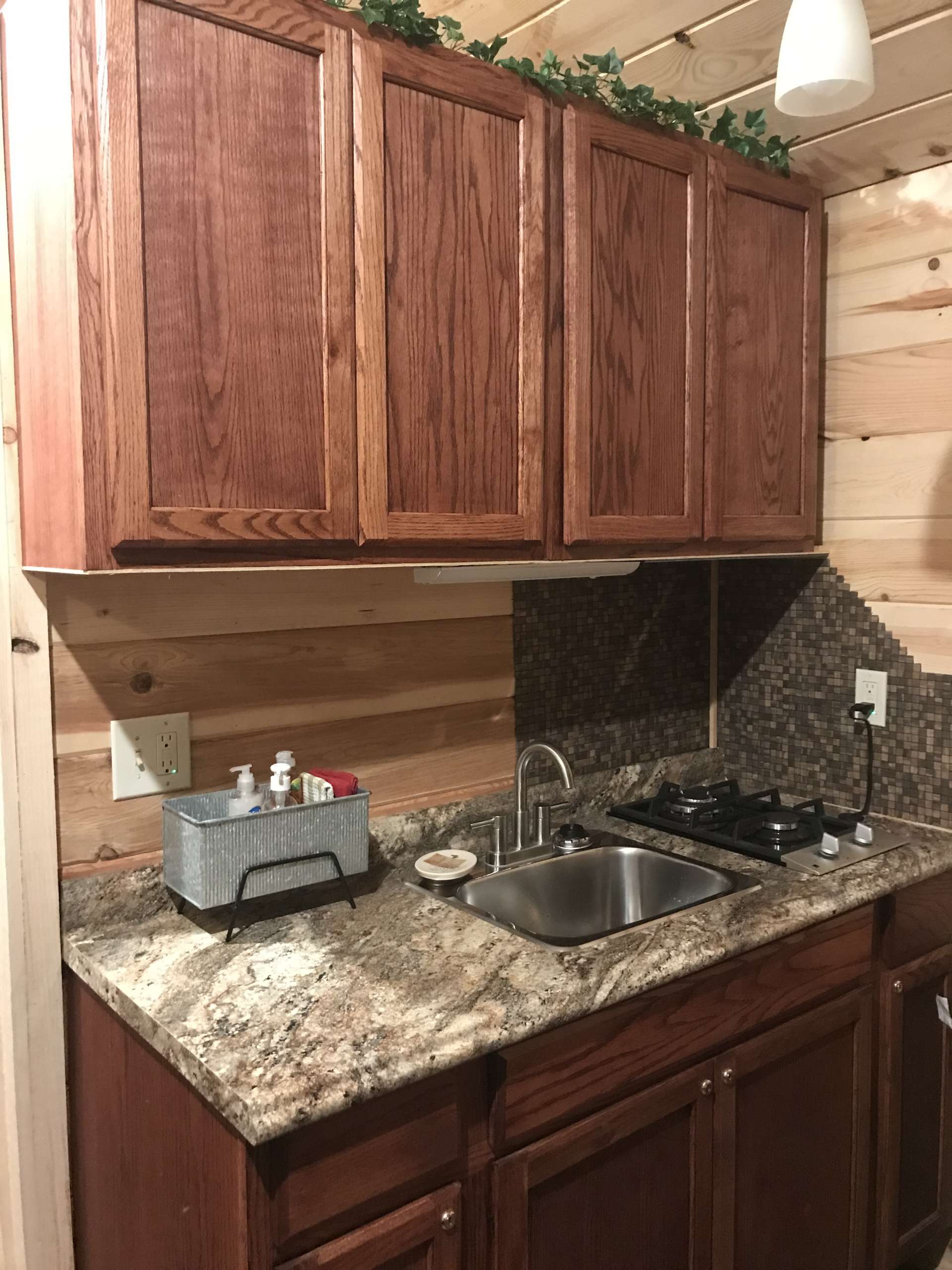 Sugar Creek is a 200 sq. ft., custom-built tiny cabin.  The studio features a Queen bed and a kitchenette with sink, gas cooktop, microwave, drip coffeemaker, and apartment sized refrigerator.